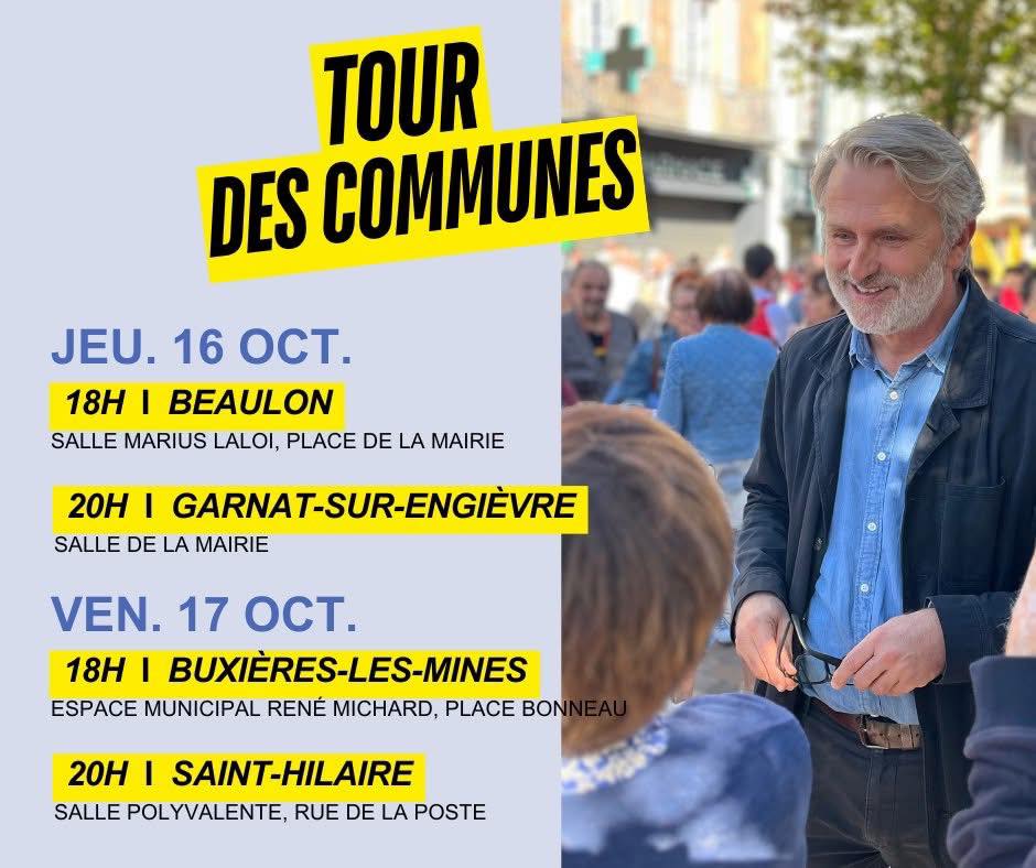 Après Coulanges, Créchy, Paray sous Briailles, Le Veurdre, Neure, Loriges, Marcenat, Pouzy Mésangy, Château sur Allier, Chapeau, Saint-Voir, Gipcy, Meillers, Fleuriel, Cesset, Chareil Cintrat, Bayet, Dompierre sur Besbre, Montbeugny, c’est à Beaulon, Garnat sur Engièvre, Buxières les Mines et Saint-Hilaire que je vous donne rendez-vous les jeudi 16 et vendredi 17 octobre (à Beaulon le 16 octobre, 18 heures, salle Marius Laloi ; à Garnat sur Engièvre le 16 octobre à 20 heures, Salle de la Mairie ; à Buxières les Mines le 17 octobre, 18 heures, espace municipal René Michard ; à Saint-Hilaire le 17 octobre à 20 heures, Salle polyvalente).