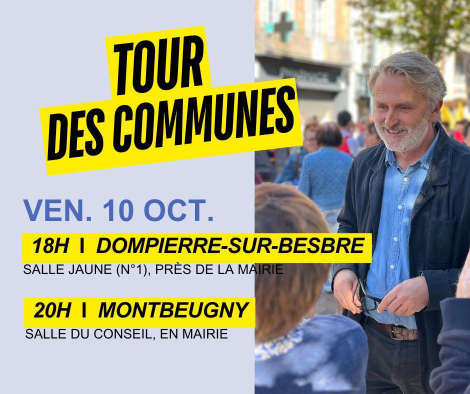 Après Coulanges, Créchy, Paray sous Briailles, Le Veurdre, Neure, Loriges, Marcenat, Pouzy Mésangy, Château sur Allier, Chapeau, Saint-Voir, Gipcy, Meillers, Fleuriel, Cesset, Chareil Cintrat, Bayet c’est à Dompierre sur Besbre et Montbeugny que je vous donne rendez-vous le vendredi 10 octobre (à Dompierre : 18 heures, salle Jaune près de la Mairie ; à Montbeugny : 20 heures, Salle du Conseil en Mairie).