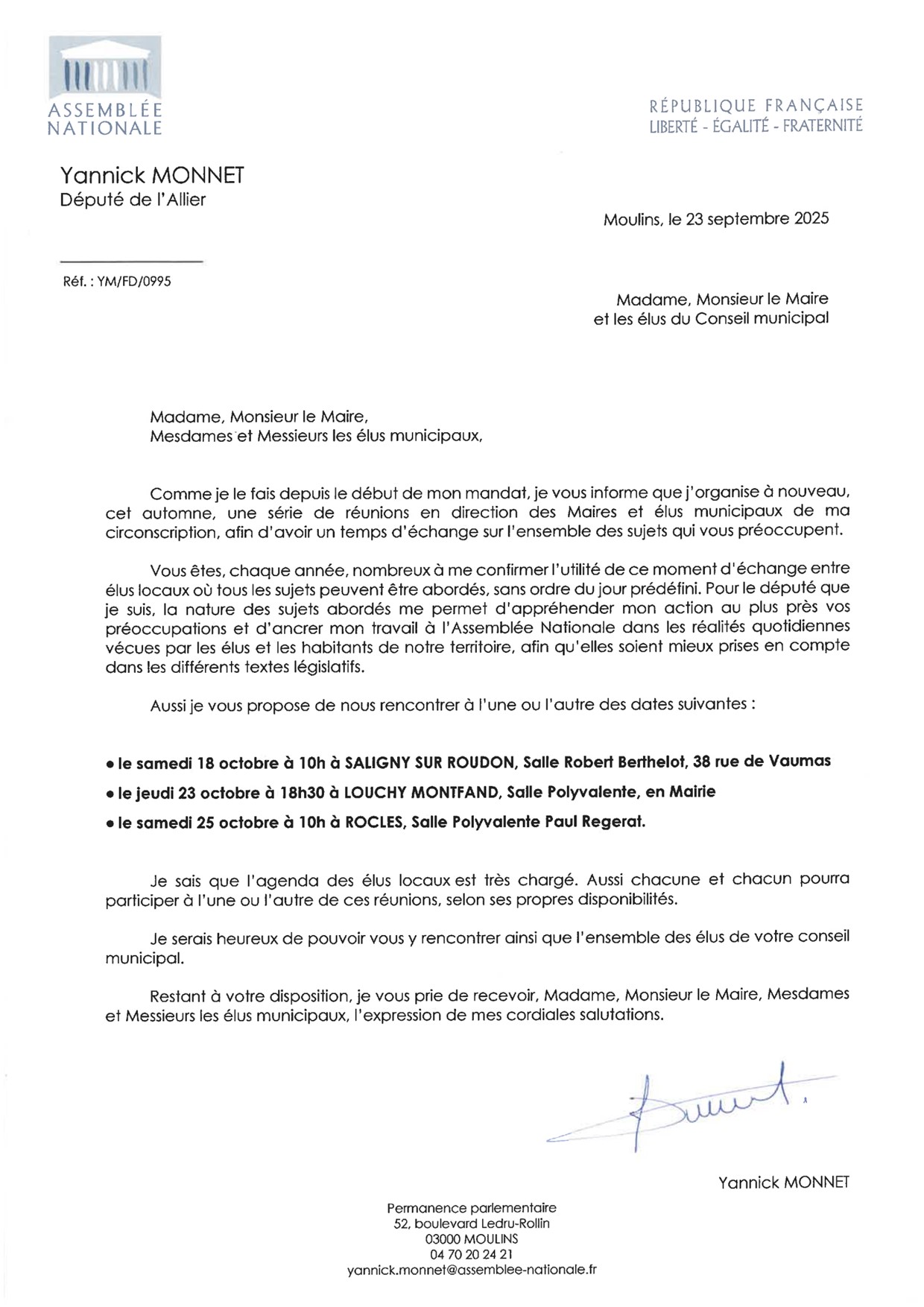 Comme je le fais depuis le début de mon mandat, j’organise à nouveau, en octobre 2025, une série de réunions en direction des Maires et élus municipaux de ma circonscription, afin d’avoir un temps d’échange sur l’ensemble des sujets qui les préoccupent.